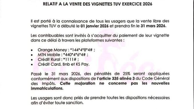 DGI – MARDI 13 JANVIER 2026 COMMUNIQUÉ RELATIF À LA VENTE DES VIGNETTES (TUV) DE L’EXERCICE 2026 janvier 13, 2026 Redaction Actualité, Economie 0 Cellule de Communication