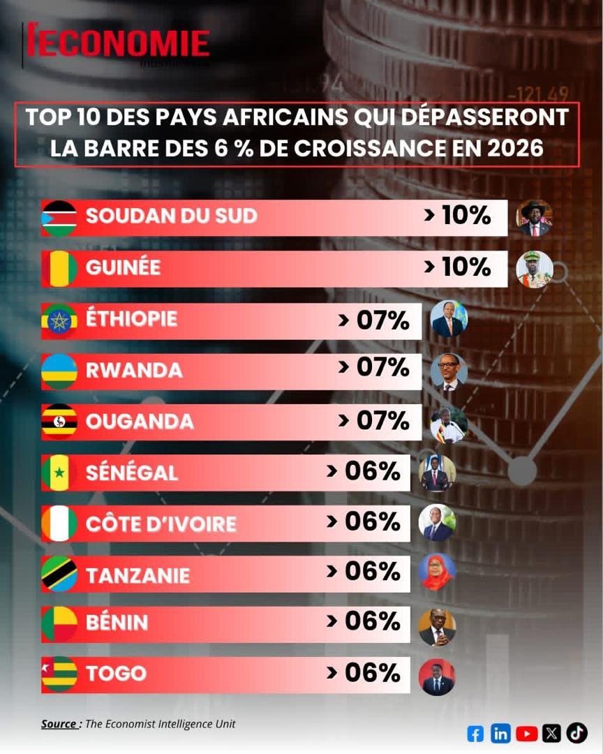 Sous le leadership de Monsieur le Ministre Mourana Soumah, le dynamisme économique de la République de Guinée rayonne désormais sur la scène internationale. Selon les dernières analyses de The Economist Intelligence Unit, la Guinée s’impose magistralement dans le Top 10 des pays africains qui dépasseront les 6 % de croissance en 2026.
