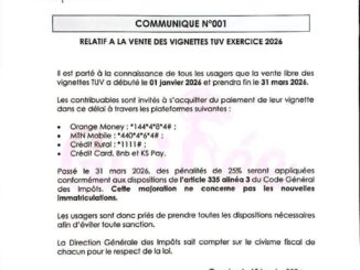 DGI – MARDI 13 JANVIER 2026 COMMUNIQUÉ RELATIF À LA VENTE DES VIGNETTES (TUV) DE L’EXERCICE 2026 janvier 13, 2026 Redaction 0