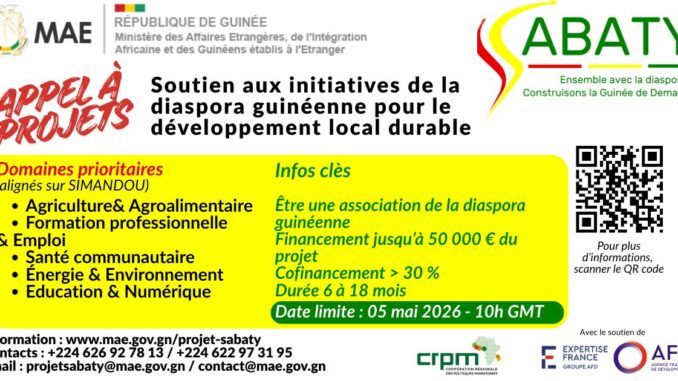 L’article APPEL A PROJETS N° 001 / 2026: PROJET SABATY : Soutien aux initiatives de la diaspora guinéenne pour le développement local durable est apparu en premier sur MINISTERE DES AFFAIRES ETRANGERES, DE L’INTEGRATION AFRICAINE ET DES GUINEENS ETABLIS A L’ETRANGER.