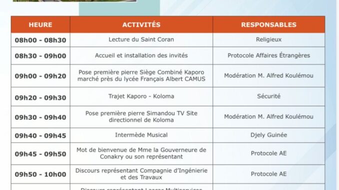 Ouverte par une lecture du Saint Coran, la cérémonie a réuni plusieurs personnalités de premier plan. Après le mot de bienvenue de la Gouverneure de Conakry, les représentants de la Compagnie d’Ingénierie et des Travaux ainsi que de Lascar Multiservices International ont réaffirmé leur engagement à livrer des infrastructures de qualité dans les délais.
